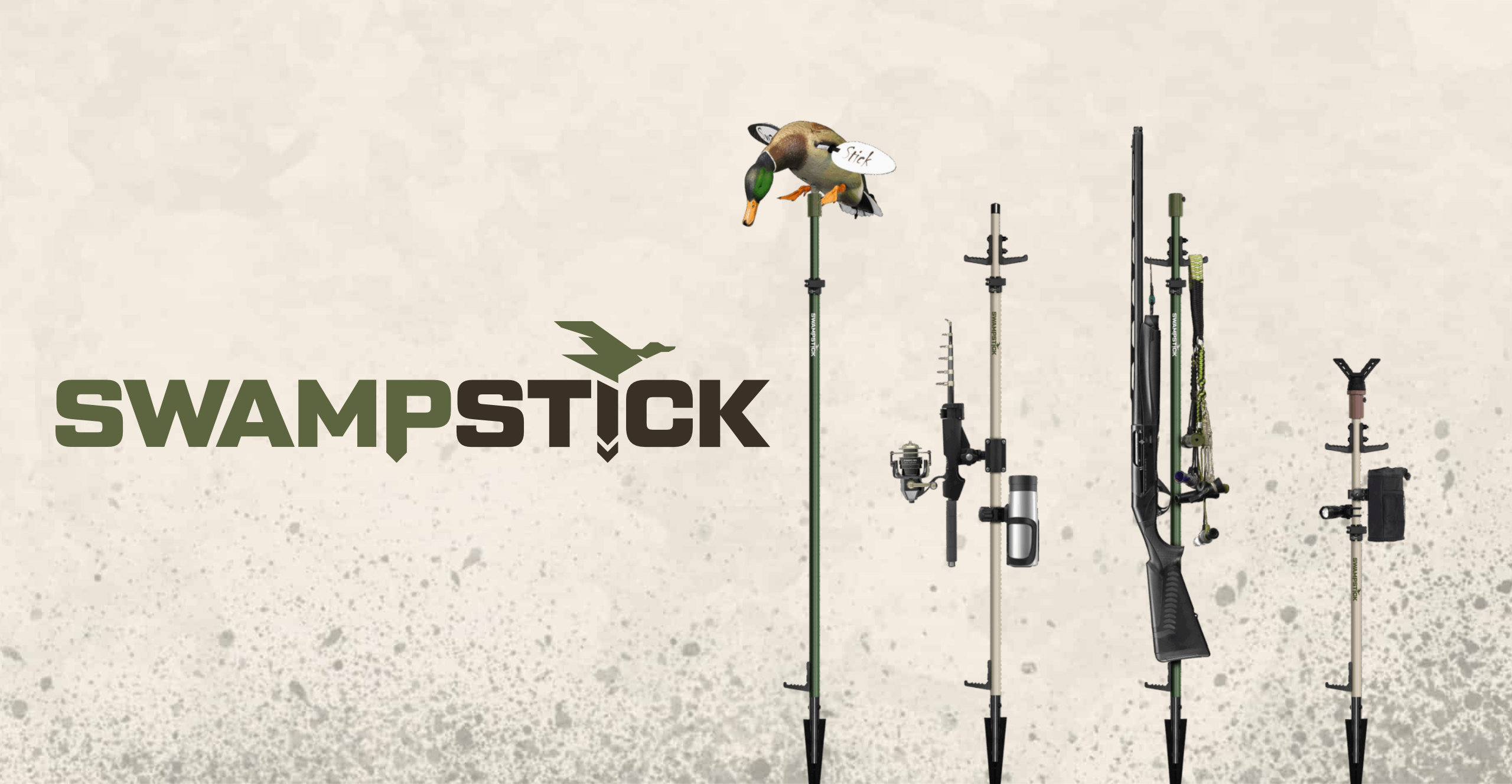 Swamp Stick’s visual identity needed to reflect the rugged environments in which their products were reliably used. We redesigned their logo to stick in their customers’ minds. The duck was kept as the core element, streamlining it into a horizontal form that fits their main product, the Swamp Stick’s long format. Sharp descenders mirror the spear tip, while the angular type ties the duck in with the typography. This style was used consistently throughout their website, product pages, and future brand extensions.